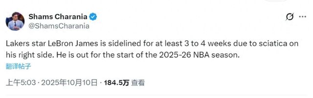 “詹姆斯因右侧坐骨神经痛,将缺阵3-4周,计划在11月中旬复出。”